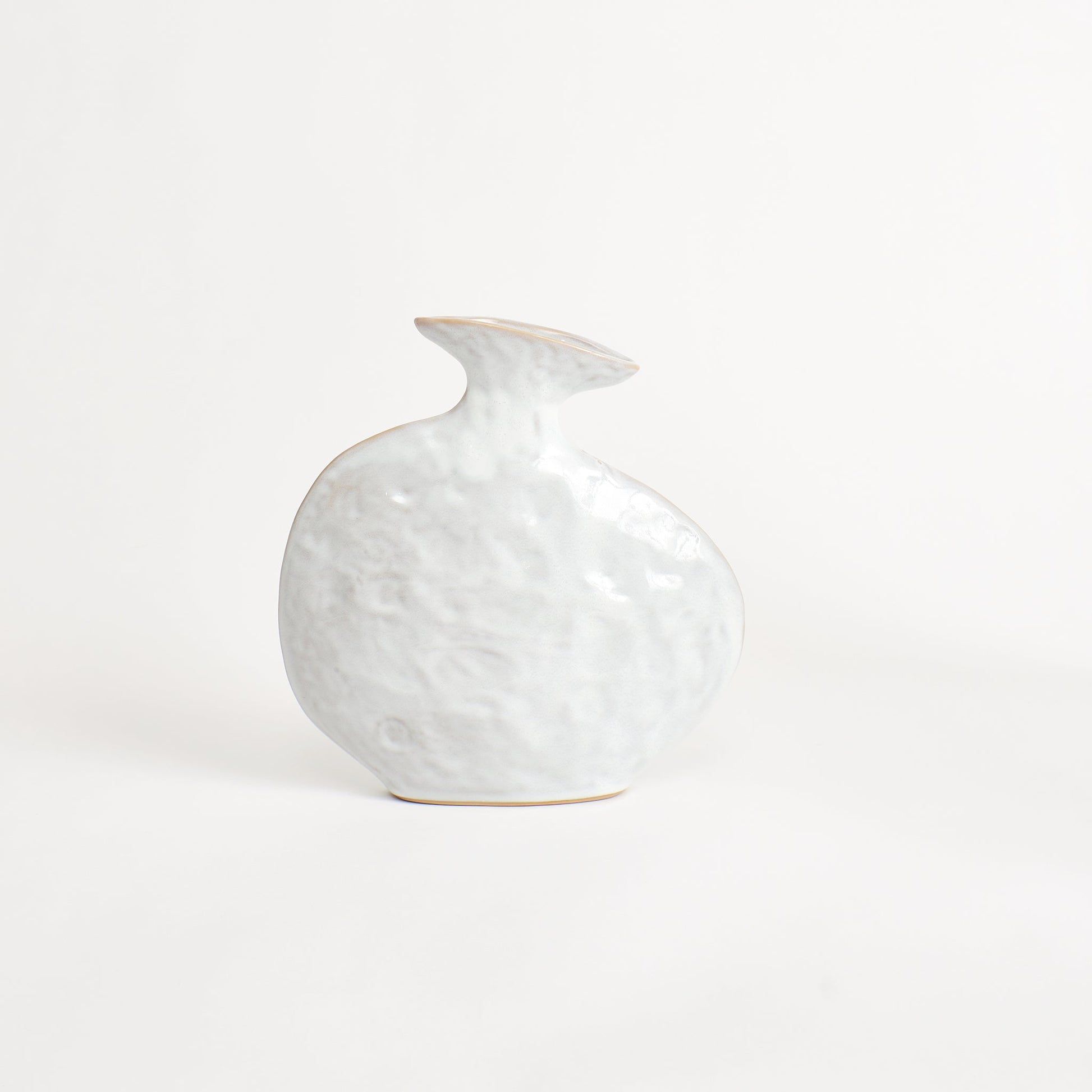 This playful vase was designed after a happy accident in the workshop while sculpting what was supposed to be a very round vase that fell off the table and flattened. This shiny white glazing appears in some places milky translucent revealing the base colour. It is hallmarked with a discreet P 213 A embossed logo.